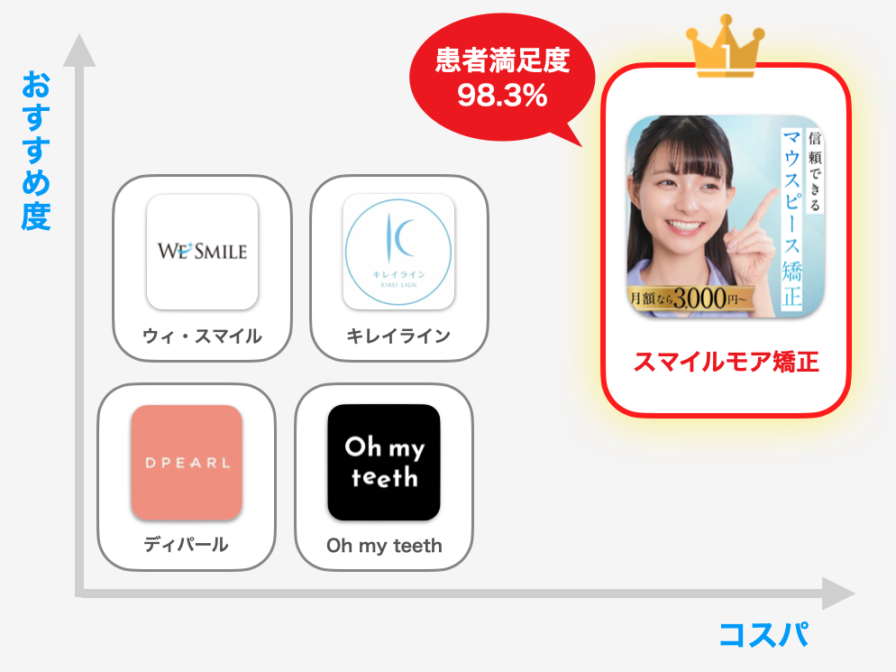 | マウスピース矯正 | ![]() スマイルモア矯正 | ![]() キレイライン矯正 | ![]() ウィスマイル矯正 | ![]() Oh my teeth | ![]() ディパール |