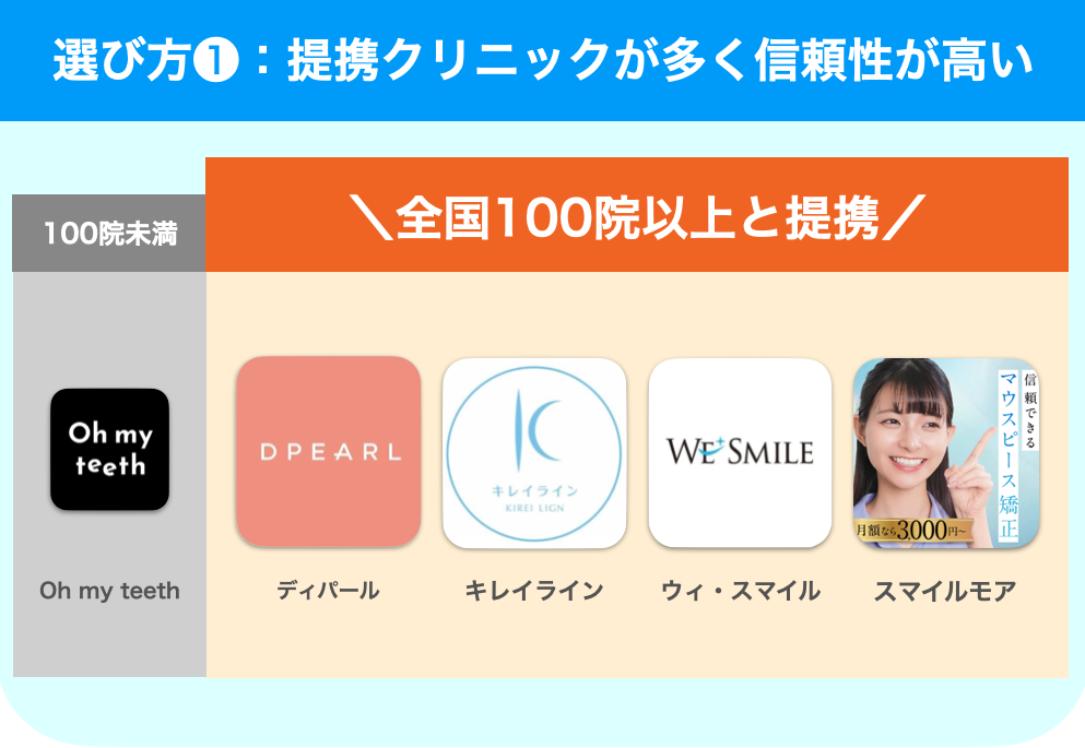 提携院が多いブランドは、クリニックや医師からの信頼性が高く、矯正症例が豊富で治療ノウハウが蓄積されています。