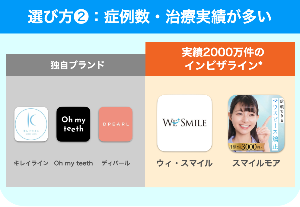 | インビザライン | 17万人以上の治療実績(*2) インビザライン採用で 痛みが少なく目立たない | 独自ブランド使用 | インビザライン採用 | インビザライン採用 | 独自ブランド使用 |