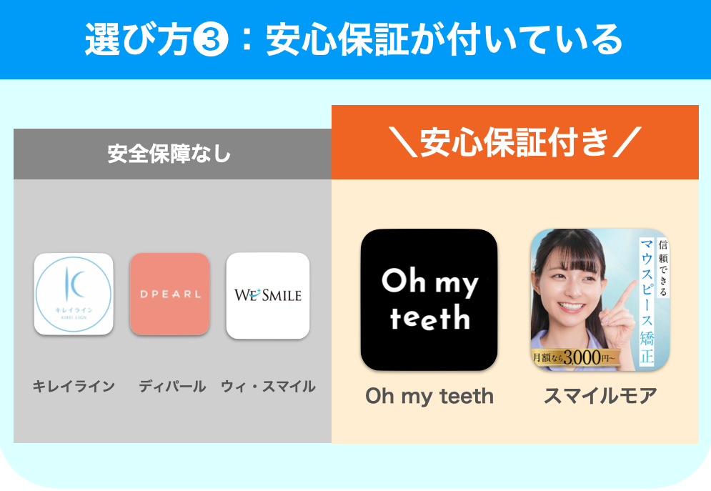 万が一、診察時のシミュレーション通りに歯が動いてくれなくても、マウスピースを作り直してくれる安心保証*も付いているのは嬉しいポイント。