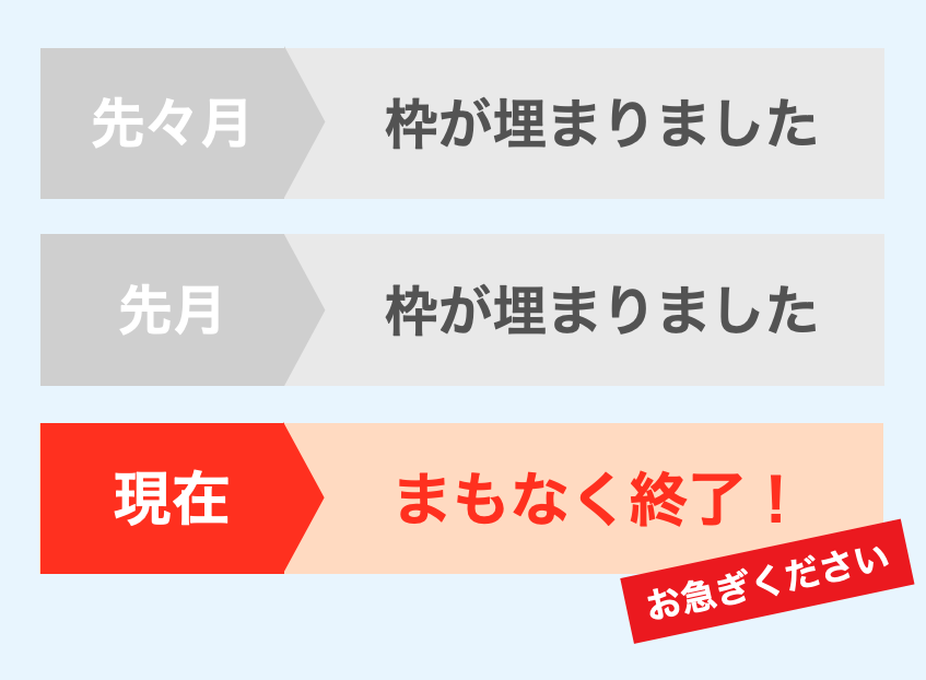 そのため、予約枠が残りわずかとなっており、お得なキャンペーンが終了してしまう可能性が高いです。